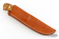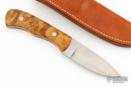 This fixed blade by Larry Page features a satin finished blade with .133" blade stock and 1.078" blade depth with full tang construction. The handle has maple burl scales and stainless steel pins. Comes with brown leather sheath. Excellent condition.