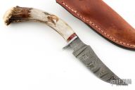 This Skinner by JA Lonewolf features a Damascus blade with .122" blade stock and 1.245" blade depth, hidden tang construction. The handle has a stainless steel guard, crown stag grip, wood spacer. Has scrimshaw of an eagles head. Excellent condition. Comes with a brown leather sheath.