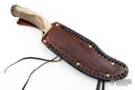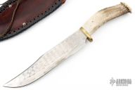 This Bowie by Silver Stag features a clip point blade with false top edge, jeweled flats, .167" blade stock and 1.855" blade depth, hidden tang construction. The handle has a brass guard and crown stag grip. Comes with a hand tooled brown leather sheath. Has some scratches and oxidation, otherwise good condition.