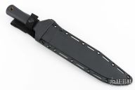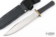 This 1st Generation Trail Master bowie by Cold Steel features a satin finished clip point blade with a false top edge, .293" blade stock and 1.510" blade depth, hidden tang construction. The handle has a brass guard and a rubber handle. Comes with a Secure-Ex sheath for a modern Trail Master. Has scratches and oxidation, has been used, has been sharpened, good user condition.
