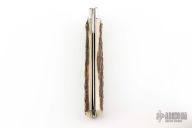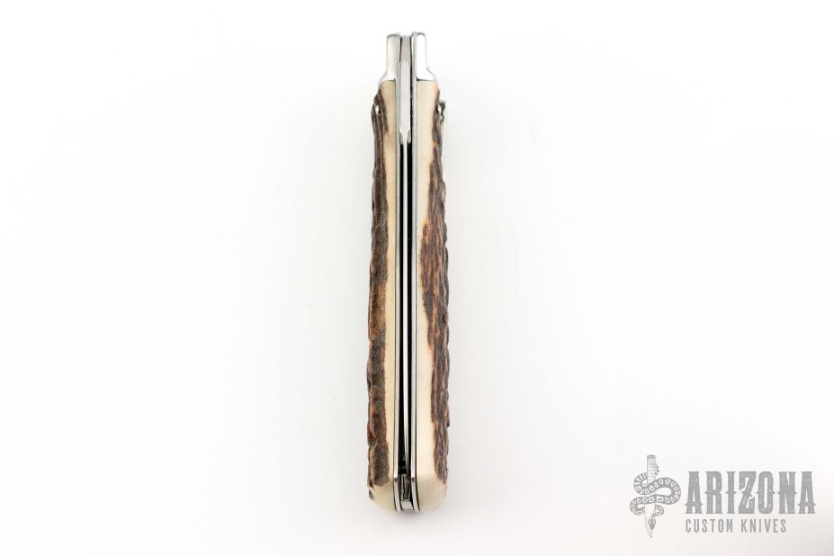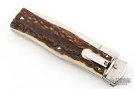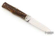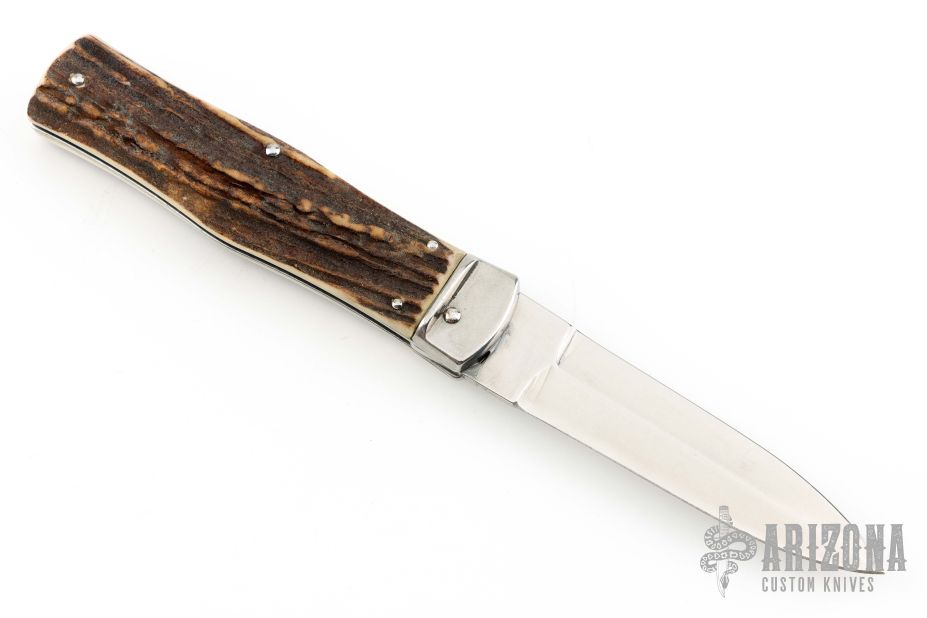 This lever auto from Mikov Knives has a mirror polished spear point blade with false top edge. The handle has polished stainless steel bolsters and liners, and stag scales. Blade favors the right side slightly in the closed position. Has some light scuffs, excellent condition otherwise.