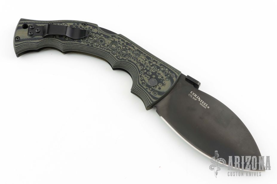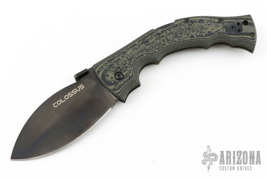 Designed by custom knife maker Mike Wallace, the Colossus is quite simply a cutting machine! Its extra-broad blade is fully flat ground, with a continuous curve that facilitates amazing shearing cuts! Made to pack as much cutting performance* into a 4 blade limit as possible, the Colossus was inspired by one simple design philosophy when it comes to cutting: If you can’t go long –go wide! Made from premium American CTS XHP steel, this beast of a blade is just perfect for everyday utility use and cutting chores. Zipping through even tough material like a hot knife through butter! The 3D CNC machined textured, and stippled two-tone American G-10 handle is not only incredibly comfortable both in the hand and in the pocket, but it also houses what is arguably the strongest lock in the industry! The Cold Steel Tri-Ad has proven itself time and time again as an unbelievably strong and safe locking mechanism – a perfect choice for a knife with this much cutting potential! Available with either a rich satin polish or deep black DLC (diamond like) coating, the Colossus is sure to become your favorite knife for everyday cutting tasks.