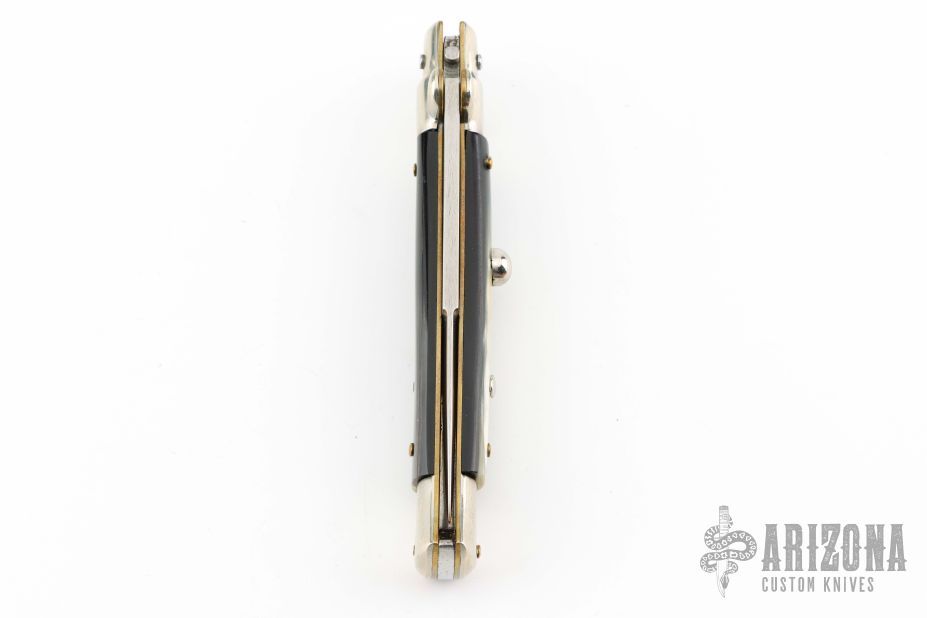 This Picklock by Frank Beltrame features a mirror polished spear point blade with false top edge. The handle has nickel silver bolsters, front and rear, buffalo horn scales, brass liners, stainless spring.  Limited edition 2007. Has some light scratches, excellent condition otherwise.