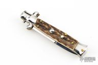 This Swivel Bolster Auto features a mirror finish spear point blade. The handle consists of aluminum bolsters and stag scales over brass D-Stamp liners and stainless steel backspacer. Steel push button. Has a few light scratches, otherwise excellent condition.