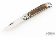 This leverlock auto features a high polished blade with a stainless spring. The handle has stainless bolsters and butt, stag scales and stainless liners. Has some scratches, otherwise good condition.
