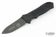This Trident Utility Folder from Masters of Defense features a black coated spear point blade with swedge, notched thumb rest, dual thumb studs. The handle is comprised of black anodized aluminum with non slip inlays on the "A" side over an inlaid steel lockbar. Black coated tip down clip is positioned for right hand carry. Lanyard hole in pommel. Comes with original box, papers and sheath. Excellent condition.