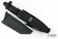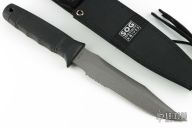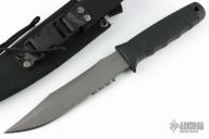This Seal 2000 Fighter by SOG Knives has a grey coated partially serrated clip point blade with hidden tang, .236" blade stock and 1.378" blade depth. Handle is contoured glass reinforced nylon with lanyard hole. Comes with original nylon sheath and a custom Kydex sheath. Excellent condition.