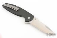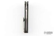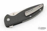 This Turbo is a Peter Carey design by Monterey Bay Knives. It features a satin finished San Mai drop point blade with swedge, notched thumbrest and flipper. The handle has carbon fiber scales, and inset lock, black tip up clip, and dragon spine backspacer.  Rides on bearings. Nice detent, lockup and blade seating. Has a couple light scuffs, excellent condition otherwise.