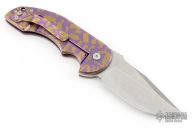 This Crossfire Mid-Tech from David Mosier has a Clip Point CPM 154 blade with stone washed finish. Thumb ramp with jimping provides excellent purchase. The sculpted titanium frame has a fuller pattern milled on the non lock side. Open frame design and titanium standoffs make for very lightweight carry EDC knife. Knife has a tip up, right hand carry titanium pocket clip. Great blade centering, crisp detent and nice lock up with zero blade play. Comes in a zipper case. This one is anodized. Excellent Condition.