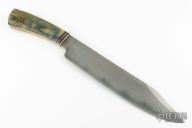 This Bowie from Master Smith Jim Crowell features a hand rub satin finished blade with "Hillbilly" gamon and false top edge, .317" blade stock and 2.075" blade depth, hidden/frame tapered tang construction. The handle a fluted nickle silver guard, nickel silver frame, mammoth ivory scales with domed nickel silver pins. Includes a zippered case. Has a couple light scratches and patina, otherwise excellent condition.