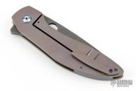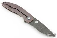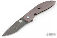 This Iceman flipper from Simeon Custom Knives features a compound ground blade with an acid/tumble finish. The bead blast, anodized titanium handles are contoured and this knife flips well and locks up with absolutely no play. Nice detent and blade is centered when closed. Sculpted pocket clip is positioned for tip up carry. Blue anodized collars and backspacer. Excellent condition.
