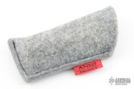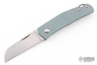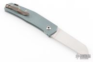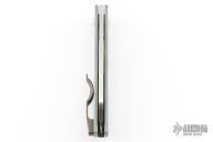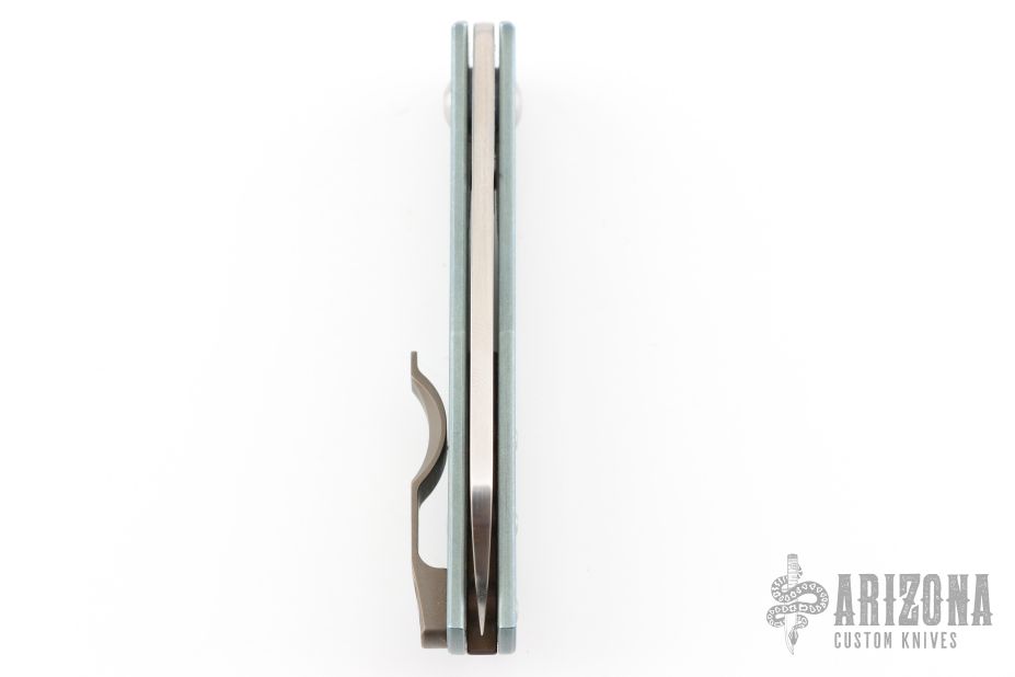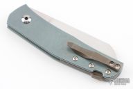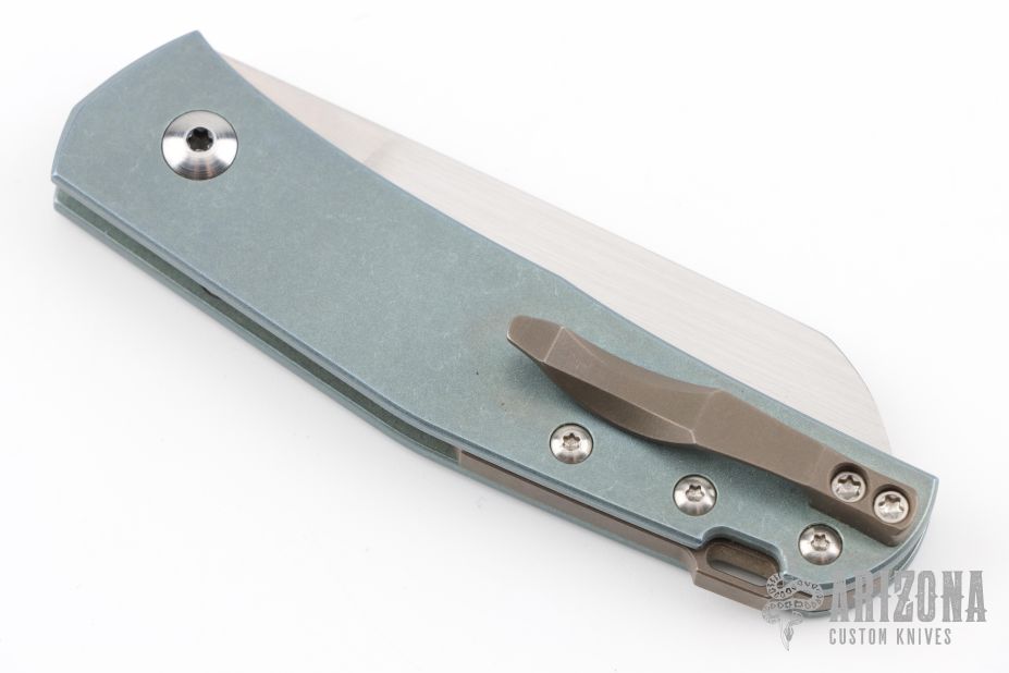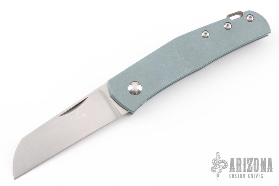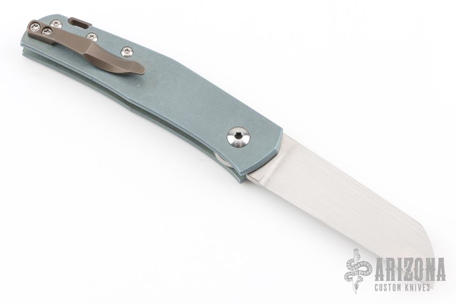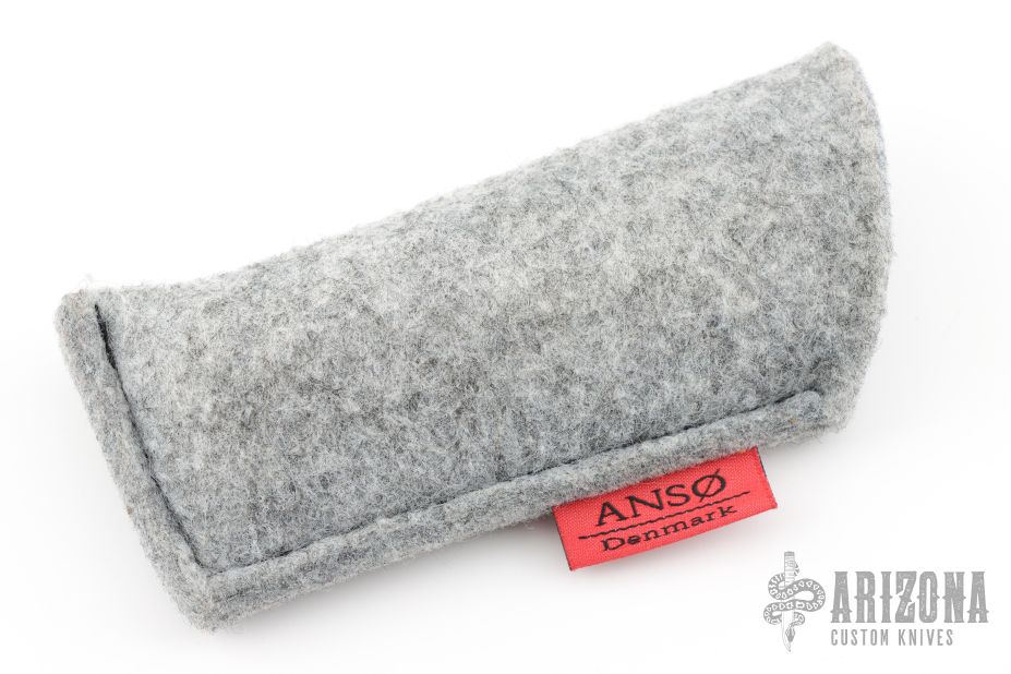 This classy little knife from Jens Anso features a hand rub satin finished wharncliffe blade with nail nick. The handle has an anodized and stonewashed titanium frame, anodized and tumbled titanium tip up clip and backspacer with lanyard hole. Has a double detent mechanism to hold but not "lock" the blade in place. Has a half stop. Perfect blade seating. Comes with original felt pouch. Has a couple light scuffs, and a couple marks on the blade, excellent condition otherwise.