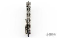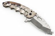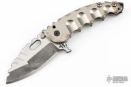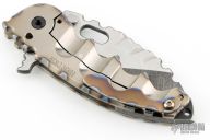 This Man of War flipper by TS Heeter features a multi-ground blade with notched thumbrest, fullers, thumbhole and flipper. The handle has a stonewashed and anodized titanium frame with tip up reversible titanium clip, steel backspacer. Has a hole for a pin with split ring that can be used to lock the blade open, or it can be removed to reveal a lanyard hole. Nice detent, lockup and blade seating. Includes original box, papers, and pin. Has a couple light scratches, otherwise Excellent condition.