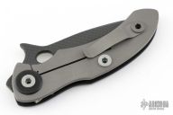 This XL MTR framelock folder by Warren Thomas features a titanium chisel ground blade with a carbon fiber laminate, has thumbhole. The handle has a black g10 scale with bead blast finish titanium frame, hardware and tip up clip. Nice detent, blade seating and lockup. Comes in a zipper case. Excellent condition.