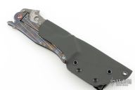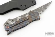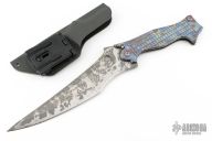 This knife by Steve Ryan features a acid etched, satin finished recurve blade with thumbhole and flipper. The handle has a milled and anodized titanium frame. Nice detent, lockup and blade seating. Comes with kydex sheath, and padded zipper case (Randall). Has a few light scratches, otherwise excellent condition.