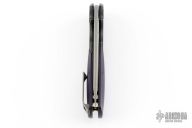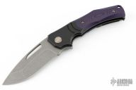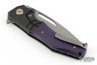 This knife by We knives features an acid/tumble finished recurve blade with thumb hole and flipper tab.  The handle features darkened finished titanium frame with purple/black g10 scales, and a matching tip up pocket clip with anodized spacers. Comes in a Begg zipper case. Has a couple light scuffs, excellent condition otherwise.