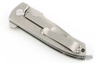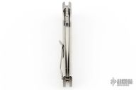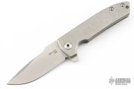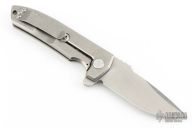 This VECP Flipper by Les George features a tumble finish CNC flat ground blade and a orange peel finished titanium frame with matching tip up clip. Hinderer lock bar stabilizer. Caged bearings. Smooth action. Nice blade seating, detent and lockup. Comes in a drawstring pouch. Excellent condition.