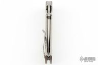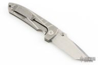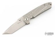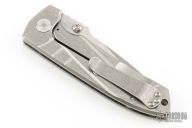 This midtech VECP tanto framelock folder from Les George features a tumble finished, CNC flat ground blade and a bead blasted titanium frame with a matching clip that is positioned for tip up carry. Hinderer lock bar stabilizer. Phosphorus bronze washers. Smooth action. Great blade seating and lockup. Comes in a drawstring pouch. Excellent condition.