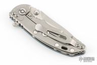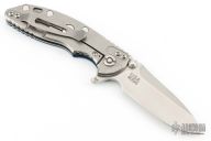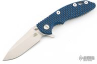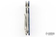 This 3" XM-18 from Hinderer Knives has a stonewashed finish wedged spear point blade with notched thumbrest and flipper. Black/blue G-10 scale and stonewashed titanium frame and pocket clip. Dual thumb studs and notched thumbrest, titanium barrel spacer. Reversible pocket clip. Strong lock up, nice detent and blade seating is center. Comes in original box, extra washers and papers. Excellent condition.