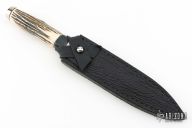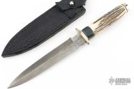 This fighter by William Miller features a double edged Damascus blade with .241" blade stock and 1.152" blade depth, hidden tang construction. The handle has a nickel silver guard, black spacer, and stag grip. Comes with a brown leather sheath. Has some light scuffs, excellent condition.