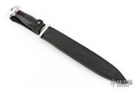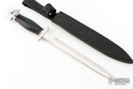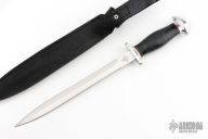 This knife by Rosarms features a mirror polish finished dagger blade with .155" blade stock and .782" blade depth, hidden tang construction. The handle has an aluminum guard and butt with a stacked leather grip. Comes with a brown leather sheath. Has some light scuffs, excellent condition otherwise.