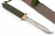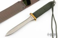 This PG-4 by EK Knives features a satin finish blade with sharpened top edge, .157" blade stock and .889" blade depth, hidden tang construction. The handle has a brass guard and green paracord wrapped handle. Comes with nylon sheath. Has some light scratches, otherwise excellent condition.