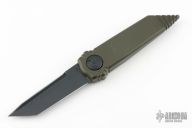 This Dreddlock model sports a green handle with a bullseye laser etching and a CPM-S30V steel blade with a black cerakote finish. The top edge of the knife has been sharpened.