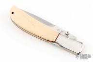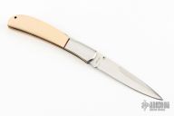 This Eagle Folder by Al Mar features a satin finished blade with single thumbstud. The handle has stainless steel bolsters, ivory paper micarta scales, red and brass liners and stainless steel backspacer. Has scuffs and scratches, great condition otherwise.