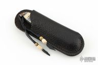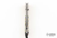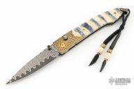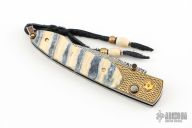 The B10 "Scepter" by William Henry features a San-Mai Damascus blade with single thumbstud with inset. The frame is Koftgari inlaid 24k gold with mammoth molar scales, 24k gold-coated stainless/titanium fittings. Sterling silver lanyard bail. Includes, leather clip case. Has a couple light scuffs, excellent condition otherwise.