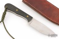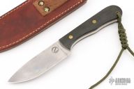 This knife by Charles May features a hand-rubbed satin finish blade, .155" blade thickness and 1.245" blade depth, full tang construction. The handle has micarta scales with brass pins and a lanyard hole with lanyard. Comes with a brown leather sheath. Has some patina, otherwise Excellent condition.