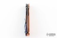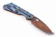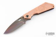 This Mick Strider SMF framelock folder features a heat color finished spear point blade with thumbhole and notched thumbrest. The handle has a copper and orange peel finished anodized titanium frame with titanium clip, tip up carry. Jimping on blade spine. Includes Hinderer "Lock Bar Stabilizer" for maximum reverse lock retention. Nice detent, lockup and blade seating. New condition.