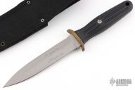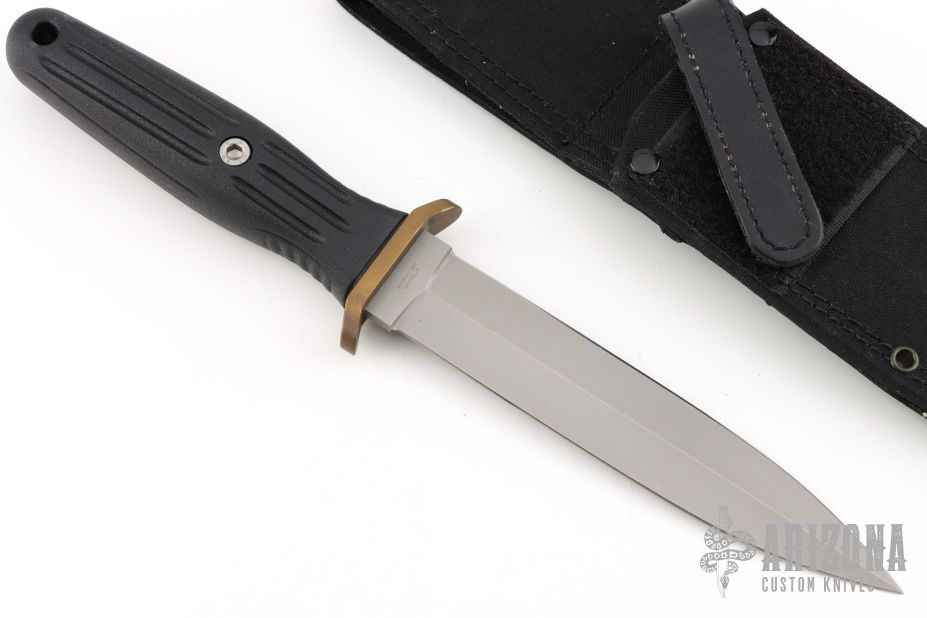 This Applegate-Fairbairn Combat Dagger (#17173) has a bead blasted 440C stainless steel DE spear point blade with hidden tang. Blade stock is .183", depth is 1.095". Handle is non-slip black polymer with contoured grooves, bead blasted brass guard, and lanyard hole. Comes with original box, and nylon Velcro belt sheath. Has some light scuffs and patina. Excellent condition.