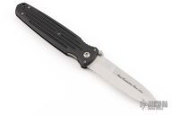 This Applegate Fairbairn Combat Folder by Gerber has a bead blasted stainless steel partially serrated spear point blade with dual thumb studs and false top edge. Handle is black contoured polymer with single stainless steel liner and lanyard hole. Comes with original box, papers and sheath. Excellent condition.