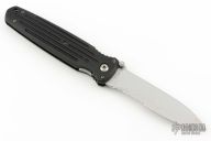 This Applegate Fairbairn Combat Folder by Gerber has a bead blasted stainless steel partially serrated spear point blade with dual thumb studs and false top edge. Handle is black contoured polymer with single stainless steel liner and lanyard hole. Comes with original box, papers, and sheath. Has some light scuffs and patina, great condition otherwise.
