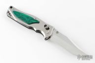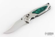 Custom Re-Make by Nobuaki Yamamoto. 3" Mirror polished VG-10 San-Mai slightly re-curved hollow ground Spear point blade with swedge and thumb notches on back, Abalon inlaid thumbstud for one hand opening, 3-1/2" Satin brushed Stainless steel handle with Malachite Gemstone inlay on both sides, SOG's strong ArcLock device, Thumb notched stainless steel liners with Black Zytel spacer, Comes with Black Nylon Pouch.