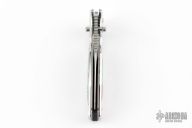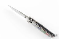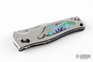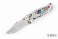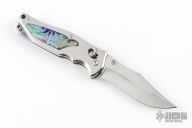 Custom Re-Make by Nobuaki Yamamoto. 3" Mirror polished VG-10 San-Mai slightly re-curved hollow ground Spear point blade with swedge and thumb notches on back, Abalone inlaid thumbstud for one hand opening, 3-1/2" Satin brushed Stainless steel handle with Washi-Paper Resin inlay on both sides, SOG's strong ArcLock device, Thumb notched stainless steel liners with Black Zytel spacer, Comes with Black Nylon Pouch.