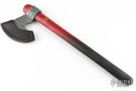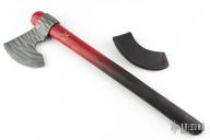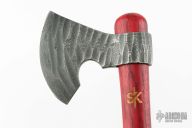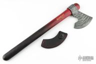 "El Diablo" Axe Features: Flat Ground Blade | Rustic, Hand Textured, High-Carbon Damascus Finish | Diablo Stained Handle | Solid Hickory Handle | Black Leather Cover with Red Stitching.