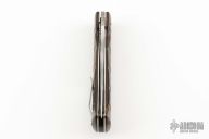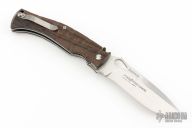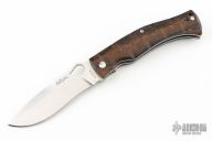 The Deimos is a Citadel designed folder from Fox Knives, it has been converted to a scale release d/a auto by Butch Vallotton. This folding knife is big on size, but feels and handles great thanks to excellent ergonomics and generous jimping on the flipper/guard and blade spine. The Deimos has a steel liner lock frame with Ziricote wood scales and a reversible tip-up carry pocket clip. The satin finished N690Co stainless steel blade has a plain cutting edge and false upper edge. The action and lockup on this mammoth knife is superb. The Deimos knife is outfitted with a Lake and Walker Safety, a secondary lock to ensure the blade stays open by blocking the release of the liner. If you're looking for a large folder that can tackle big and small jobs without missing a beat, this may be the knife for you!