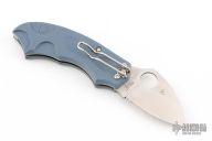 Set inside the handle is a Phantom Lock that has no visible unlocking mechanism. To unlock: Settle your thumb on the divot located on the end of the folder (over the bug). Push forward, moving the handle scale downward/forward a couple millimeters releasing the blade, easily done with one-hand. Along the underside of the handle a succession of angles form placement points for the hand and channel ergonomic grip into control over the cutting edge. Steel liners inside the FRN boost the lock's strength and a double as a plate for securing screws attaching the tip-down tension-wire clip. Shaped in a modified leaf pattern, the blade is hollow-ground with a spine cusp for thumb traction.