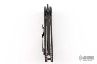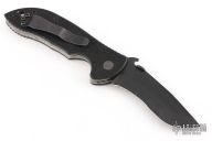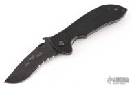 "This is the Emerson Mini Commander - a smaller and more pocket friendly Commander. It has the "wave shaped feature" and is just as formidable as its full sized father. Strong as a Bull Moose and tough as nails. The Mini-Commander features our Patented "wave shaped opening feature" or Remote Pocket Opener. In an emergency or injury situation the knife can be opened with one hand as it is drawn from the pocket." This one has a black partially serrated blade with wave, notched thumbrest and thumbdisc. The handle has black G-10 scales, titanium liners, black G-10 backspacer, tip up black stainless steel clip, lanyard hole at the butt. #10520. Comes with original box and papers. Has some light scuffs and scratches, great condition otherwise.