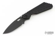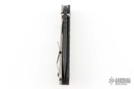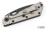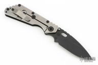 This Mick Strider SMF Fatty framelock folder features a black blade with thumbhole and notched thumbrest. The handle has a black aluminum and stonewashed titanium frame with titanium clip, tip up carry. Jimping on blade spine. Nice lockup, detent, and blade seating. NSN: 1095-01-531-5015. Excellent condition.