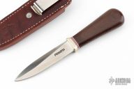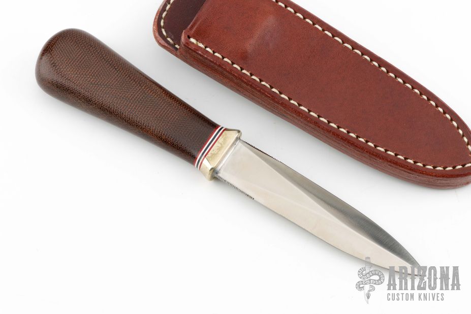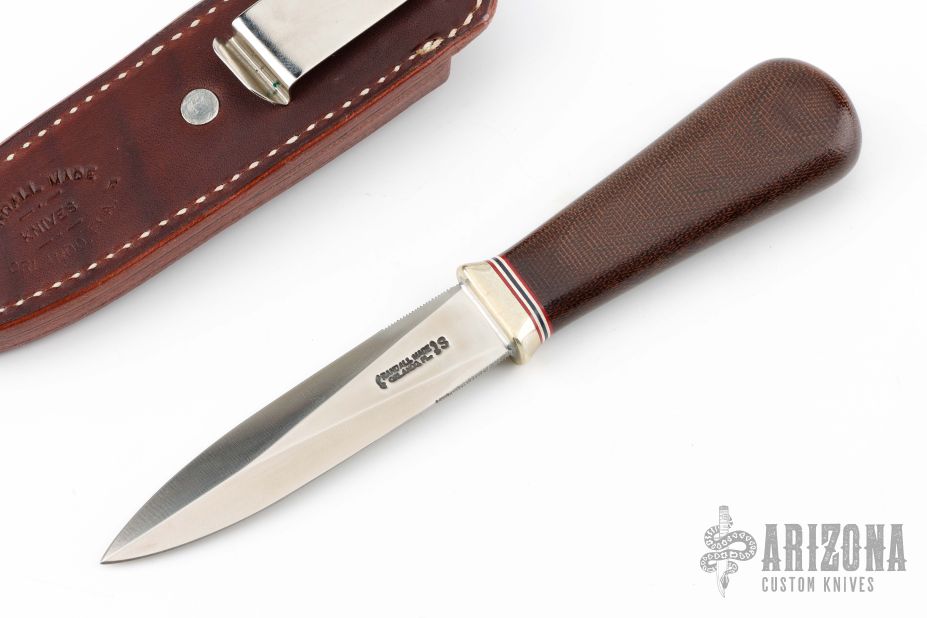 This Model 24 Guardian by Randall Made Knives features a satin finished double-edged blade with notched finger rests, .166" blade stock and .844" blade depth, hidden tang construction. Brown canvas micarta grip with red/white/blue spacers and a nickel silver guard. Both edges of the blade are sharpened with 1" of thumb notches. This model was designed in 1978 for use by police, undercover agents and law enforcement personnel for self-protection and as a back-up weapon. Comes with a brown leather sheath w/ boot clip. Excellent condition.