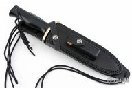 This Model 14 from Randall Made Knives features a satin finished blade with a sharpened top edge, .217" blade stock and 1.388" blade depth, full tang construction. The handle has a forward curved nickel silver guard and black linen micarta handle. Comes with black leather sheath. Excellent condition.