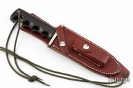 This Model 15 Airman by Randall Made Knives features a clip point blade with a sharpened top edge, .223" blade stock. 1.262" blade depth, full tang construction. The handle has black linen micarta handle with finger grooves and a nickel silver guard. The Model 15 is designed especially for heavy-duty use and to be as nearly indestructible as possible. Comes with a brown leather sheath. Has a couple light scratches, otherwise excellent condition.