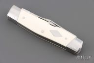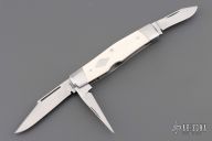 This three blade Cattle Knife from Jim Dunlap features hand rub satin finished blades with nail nicks. The handle has stainless steel bolsters, front and rear, interior mammoth ivory covers with a stainless steel escutcheon, stainless steel liners and springs. Half stop on each blade, flush in all positions. Excellent condition.