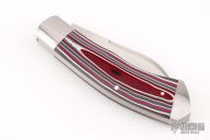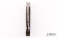 This Dino by Tim Robertson features a hand rub satin finished blade with nail nick. The handle has fordite covers, stainless escutcheon and stainless liners/backsrping. Half-stop flush in all positions. Excellent Condition.