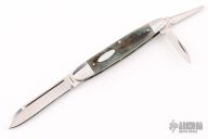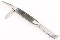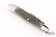 This 3-Blade knife by Luke Swenson features hand rub satin finished blades with nail nicks and long pull. The handle has stainless steel bolsters with integral liners, mammoth ivory covers, stainless steel escutcheon, springs and jeweled liners, has half-stops, flush in all positions. Excellent condition.