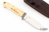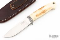 This Loveless Style Semi Skinner by Jim Jacks features a hand rub satin finished blade with engraved stainless guard, and mammoth scales with black liners, .147" blade thickness and 1.042" blade depth, full tapered tang. Excellent fit and finish. Comes with brown leather sheath and zipper case. Excellent condition.