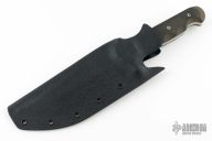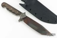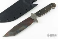 This fighter by DSK Tactical features a vulcan finished blade with false top edge, .268" blade stock and 1.712" blade depth, full tang construction. The handle has bead blasted titanium bolsters, black canvas micarta scales. Comes with a kydex sheath and zippered case. Has some light sheath scratches, otherwise excellent condition.