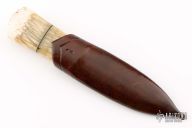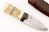 "I make mostly daggers, fighters and what I call “Kwaikens” but also swords and folding knives. I primarily use 1050 carbon spring steel and damascus of various compositions and on occasion, stainless steel for the blades. For the 1050 I employ a clay “tempering” technique that gives the blade a beautiful temper line (hamon) as well as a hard edge while maintaining a flexible core of the blade. These blades are rough ground and then finished off by hand with files and sandpaper before the final stage of etching the blade to bring out the hamon. When it comes to damascus, I tend to lean towards a simpler random or a twist pattern that goes with the overall simplistic scheme of my knives. These blades are worked and finished in a similar fashion as the carbon steel ones. I use stainless steel, mostly Damasteel stainless damascus, for folders, art knives ( for ex. Skull Cleaver and Druid Sickle) and some full-tang dress-knives, my Tuxer model, or upscale hunting/skinning-knives. For the handles and wooden sheaths I use rare exotic hardwoods, ancient ivories and bone material from all over the world. Even large pieces of natural amber has found its way onto a couple of my knives. A few wood favorites are Snakewood for its amazing striped grain pattern, Masur birch, Eucalyptus , and Redwood burl for its sometimes silky appearance."